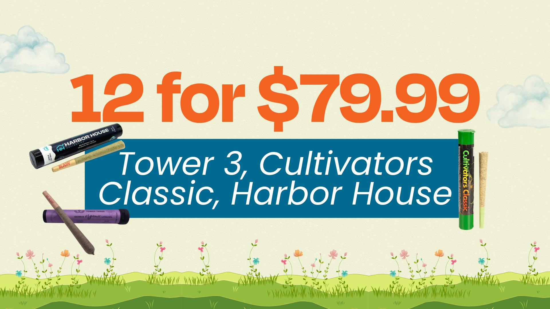 12 1G pre-rolls for $79.99 – Tower 3, Cultivators Classic, Harbor House